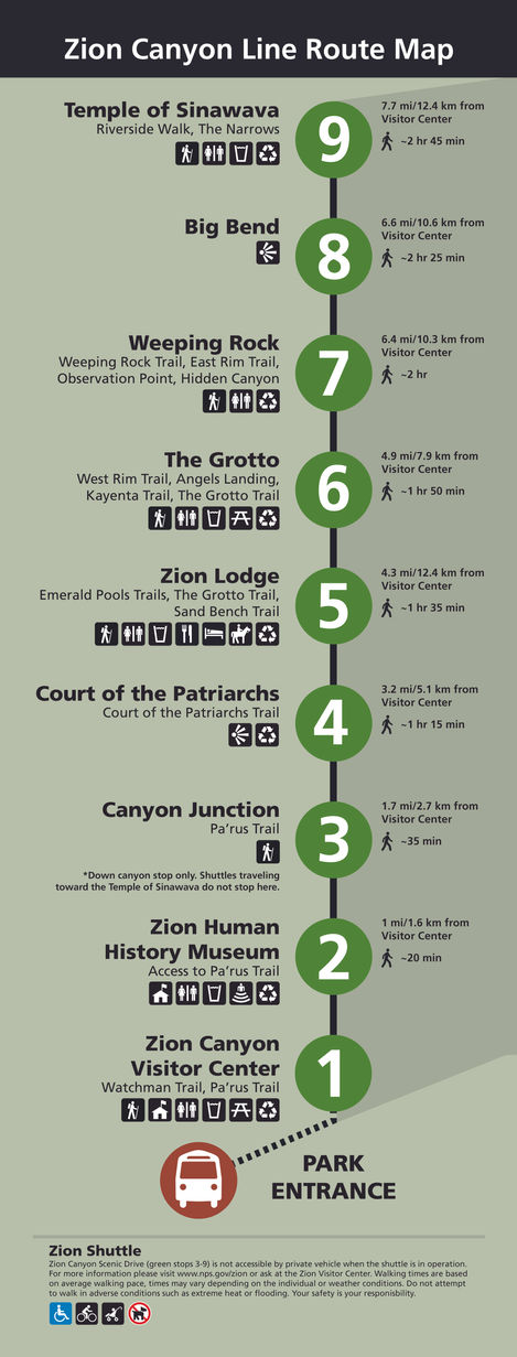 I was asked to do a simple redesign for the shuttle stop maps that are used for all the stops in Zion and the town of Springdale. This was needed as the park wanted to communicate additional information that was not on the original maps, and the original maps were very sun-baked and hard to read. The new information that was to be included were things such as walking distance and time, and new amenities that have been added since the original installation.